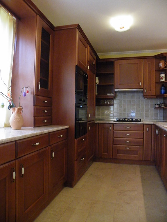 Zum Küchenmöbel passen klassische Holzstühle mit gepolsterter Sitzfläche in geschnitzter oder gepolsterter Ausführung.