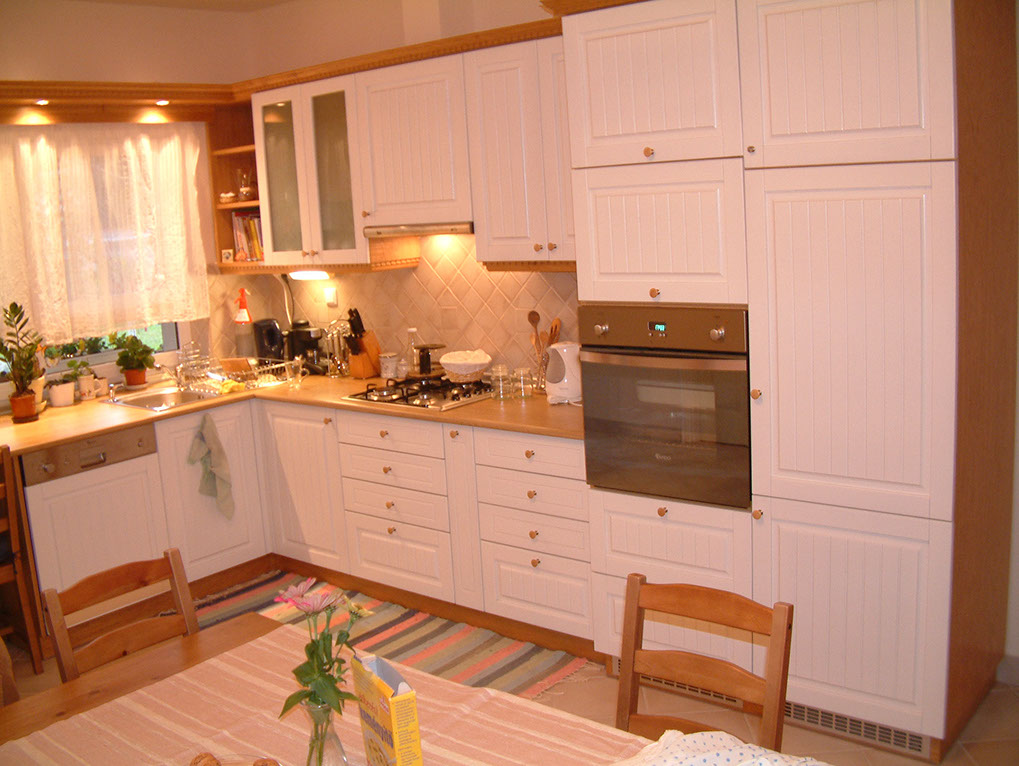 Typisch ist das konventionelle Design. Grundsätzlich wird aus Vollholzbauplatten produziert. Einheitliche Farben, Gewürz-kästchen, Rankgitter und Ziergeländer färben die Möbel. Man kann dazu Handgriffe aus Holz oder Kupfer wählen.