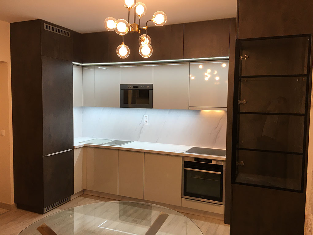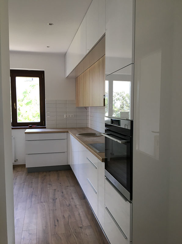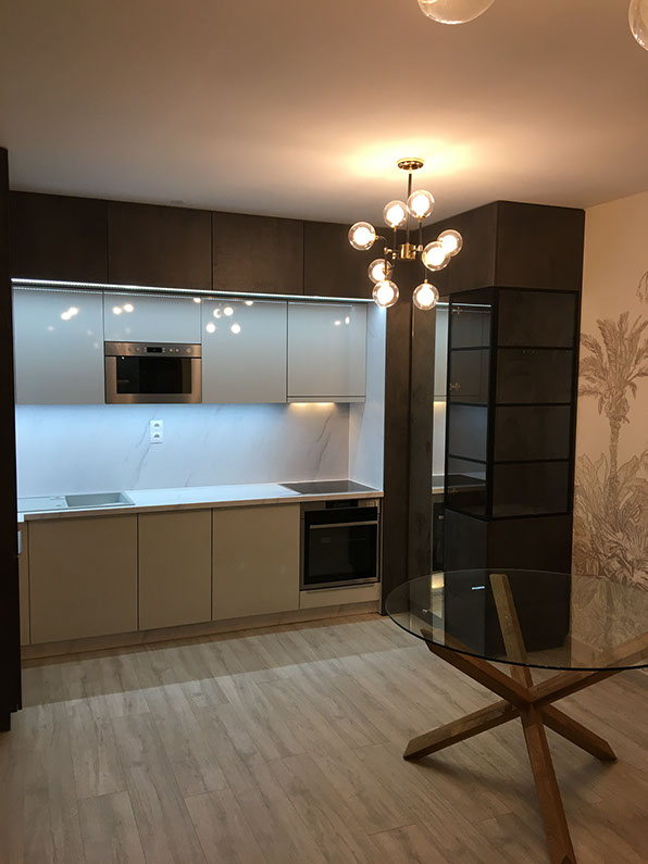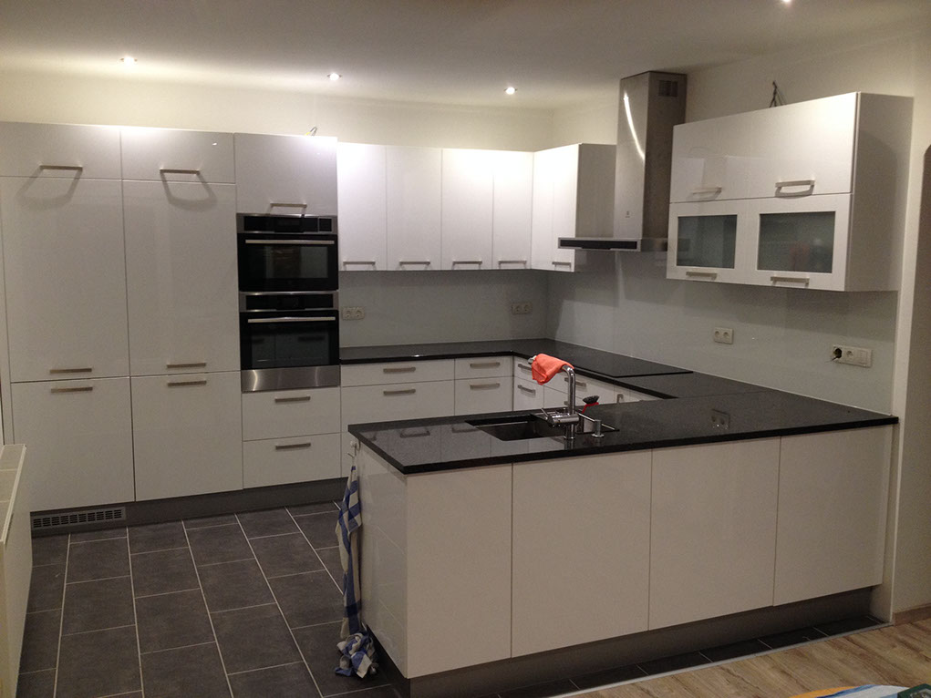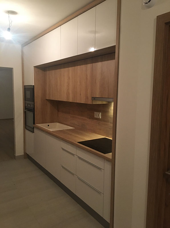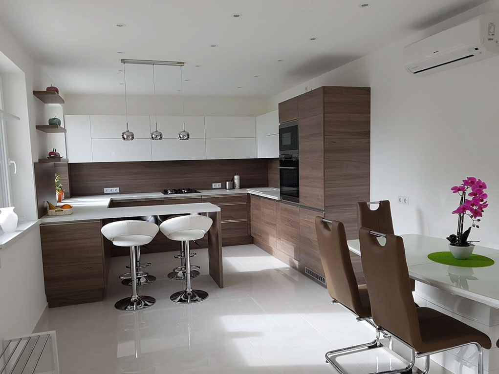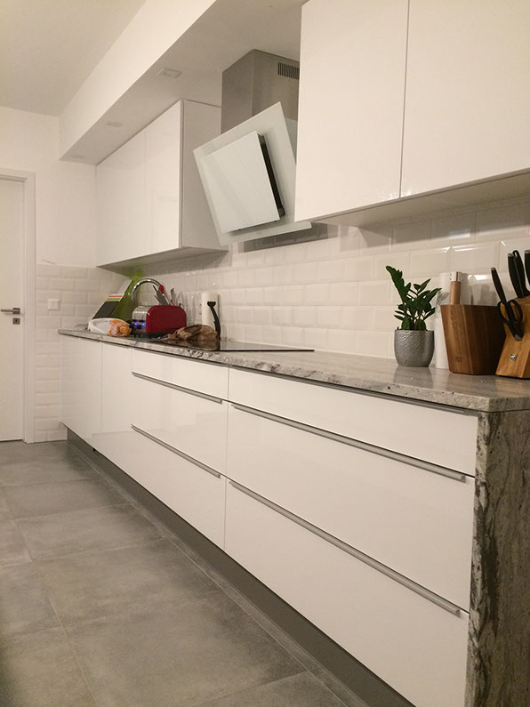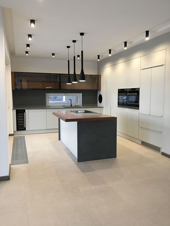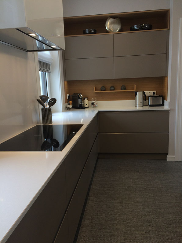 Die Wände brauchen nicht mit Fliesen bedeckt zu werden, sondern man kann laminierte oder Glashinterwandplatte verwenden. Das Küchenmöbel besteht aus vielen Elementen aus Stahl oder Glas.
