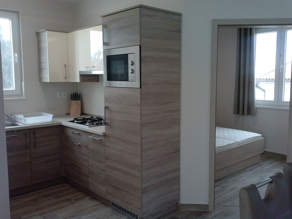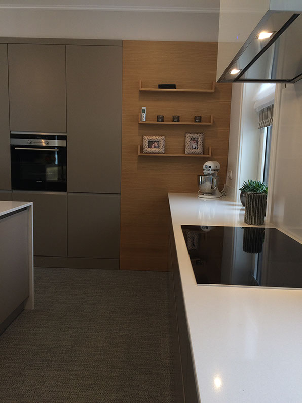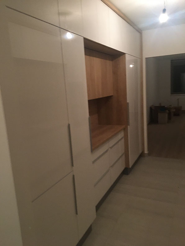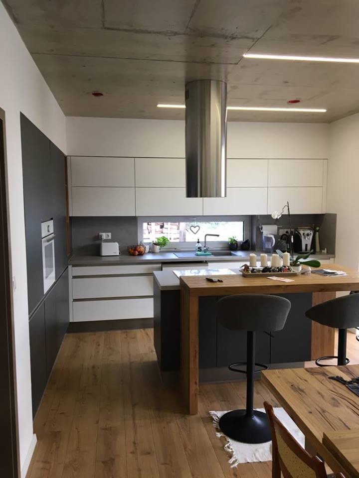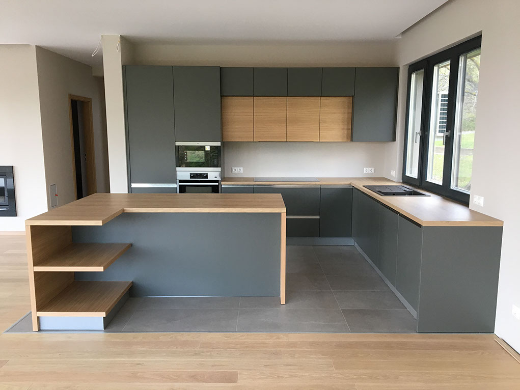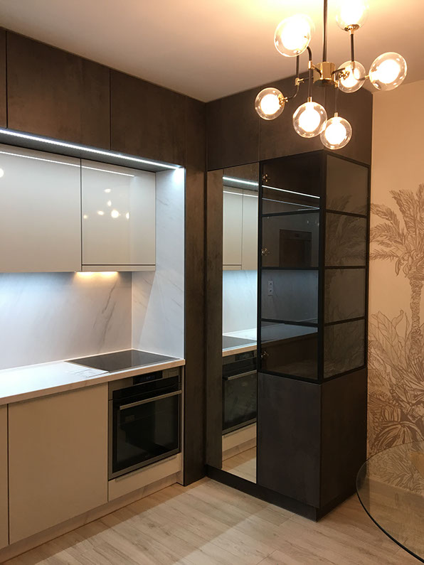 Statt der konventionellen Oberschränke erscheinen die niedrigen Elemente, die entweder nach oben öffnend oder lifttürähnlich sind.
