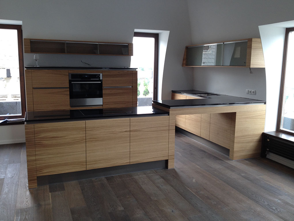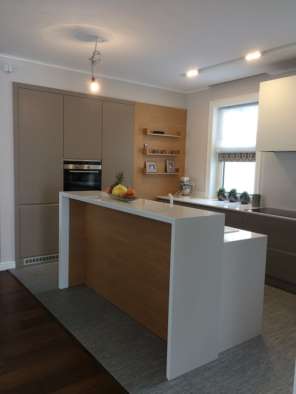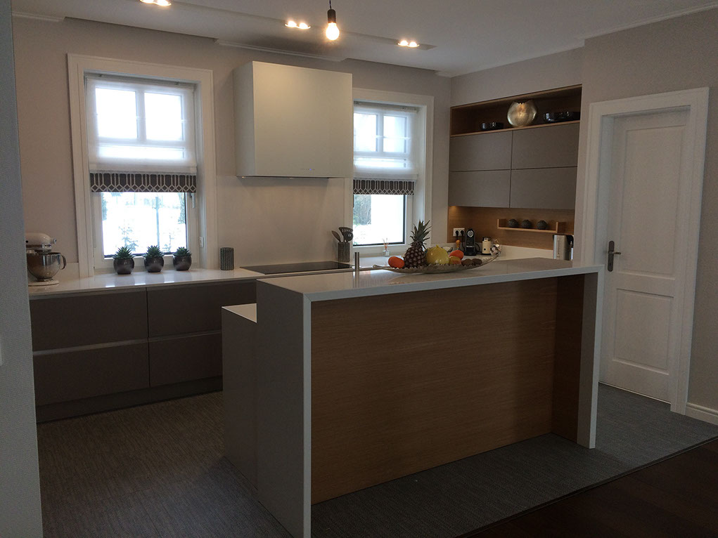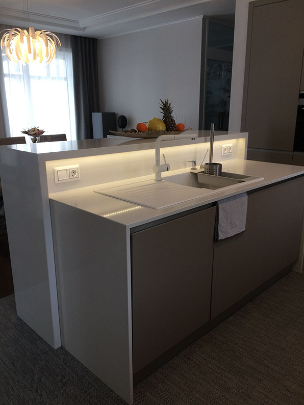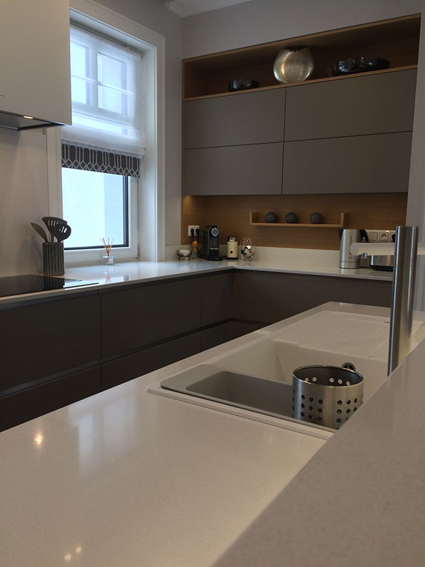Die Farben sind schwarz, weiß, grau, braun gebrochen manchmal durch je eine klare Farbe. Sein Kennzeichen sind tiefe Schubladen für Geschirre. Die Einbauspüle aus Granit oder rostfreiem Stahl schmiegen in die Möbelbauplatte ein.