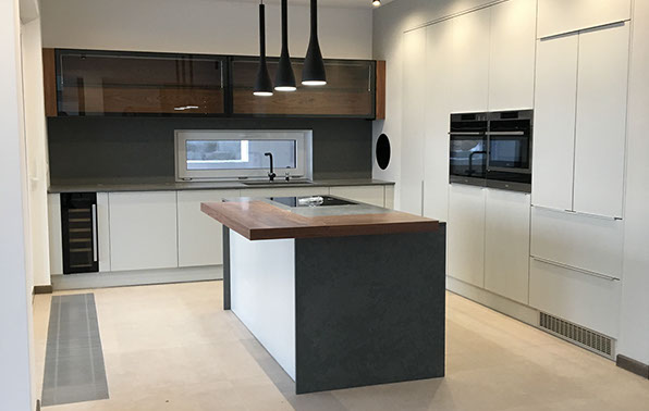 Statt der konventionellen Oberschränke erscheinen die niedrigen Elemente, die entweder nach oben öffnend oder lifttürähnlich sind.
