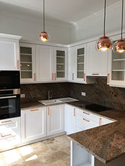 Conventional design is typical. It is usually made of wood door-boards. The colours are the same. Spice racks, trellis and decorative guards make it vivid. You can also choose either porcelain or copper handles.