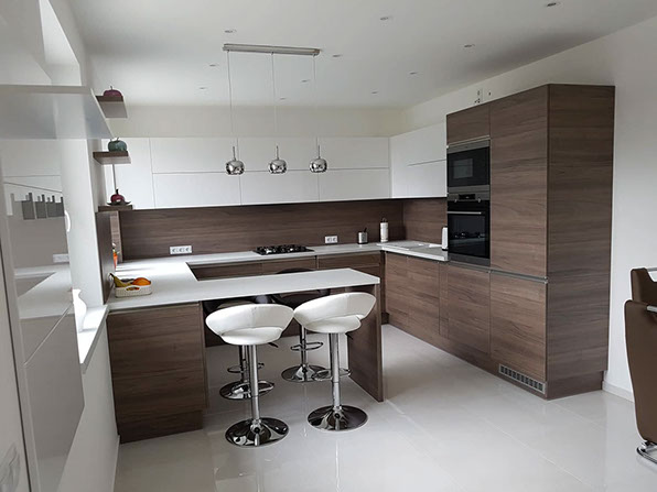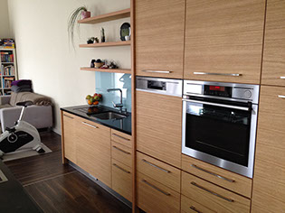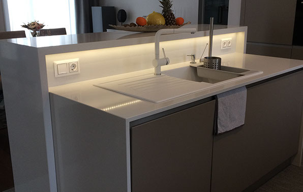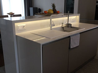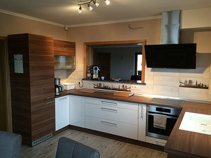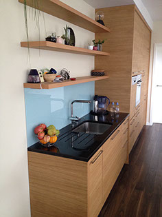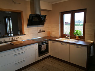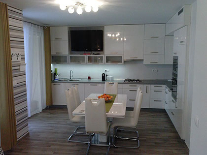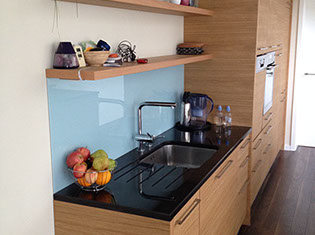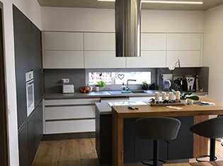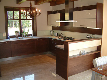 A falakat nem szükséges csempével borítani, helyette alkalmazhatunk laminált, vagy üveg hátfalpanelt. A konyhabútor sok fém, illetve üveg elemből áll.