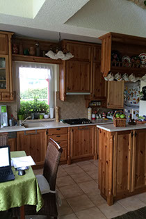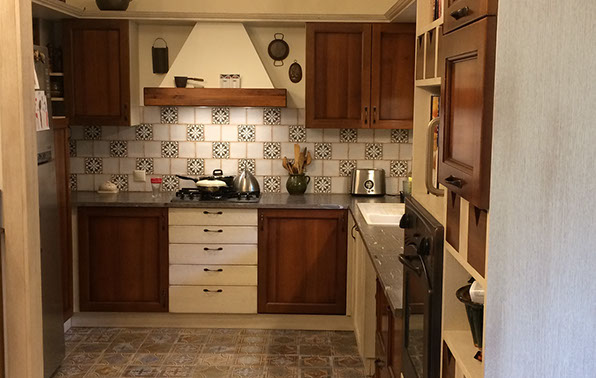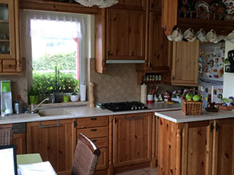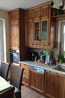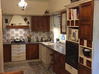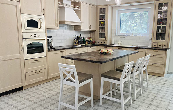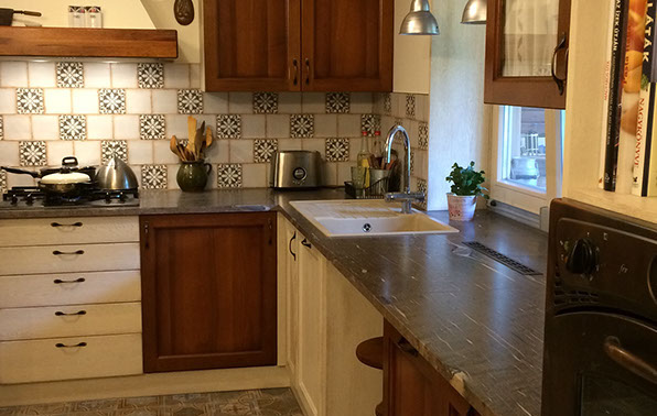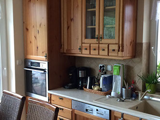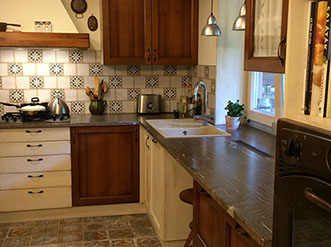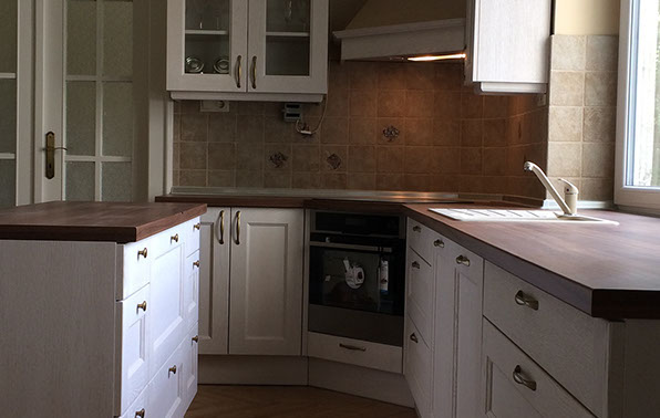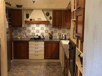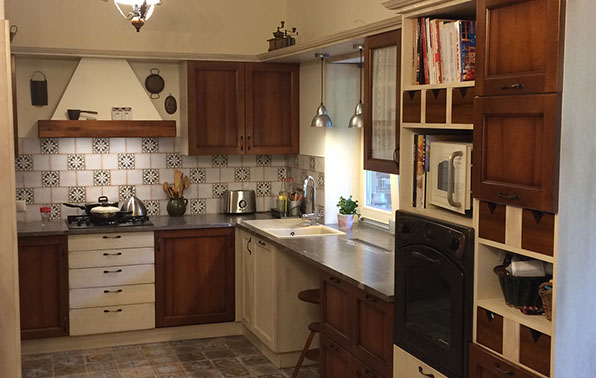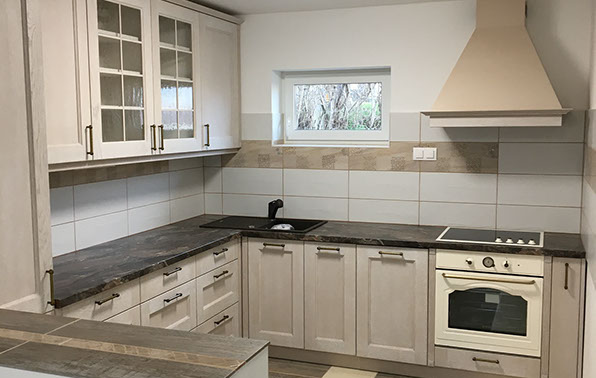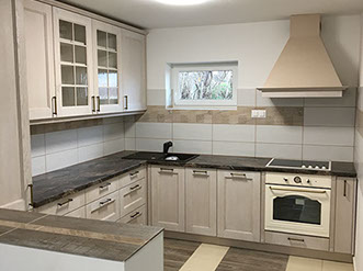 A konyhabútorba rusztikus megjelenésű sütő illik, és integrált mosogatógép, amelynek kezelőpanelje nem látszik.