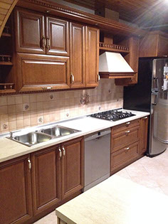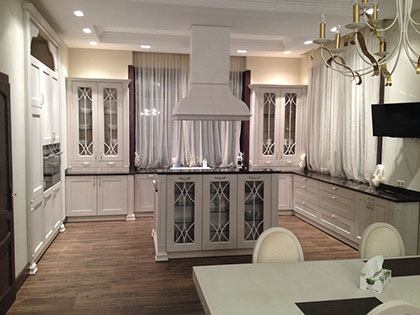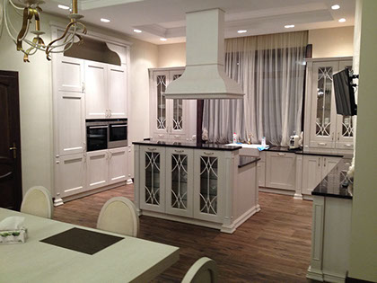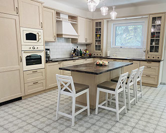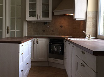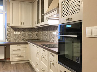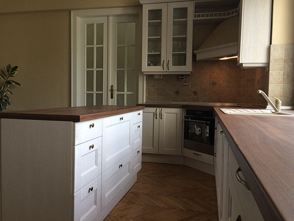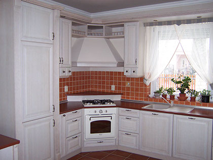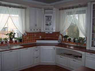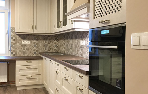 Ebben stílusban meghatározó elem a kürtős páraelszívó, melynek burkolatát mi alakítjuk ki.