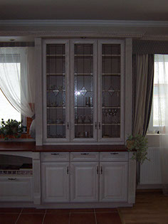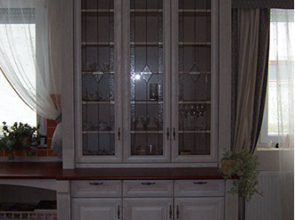 Ehhez a stílushoz jól illenek a Tiffany üveggel díszített ajtók, melyeket kérésre elkészíttetünk Önnek.
